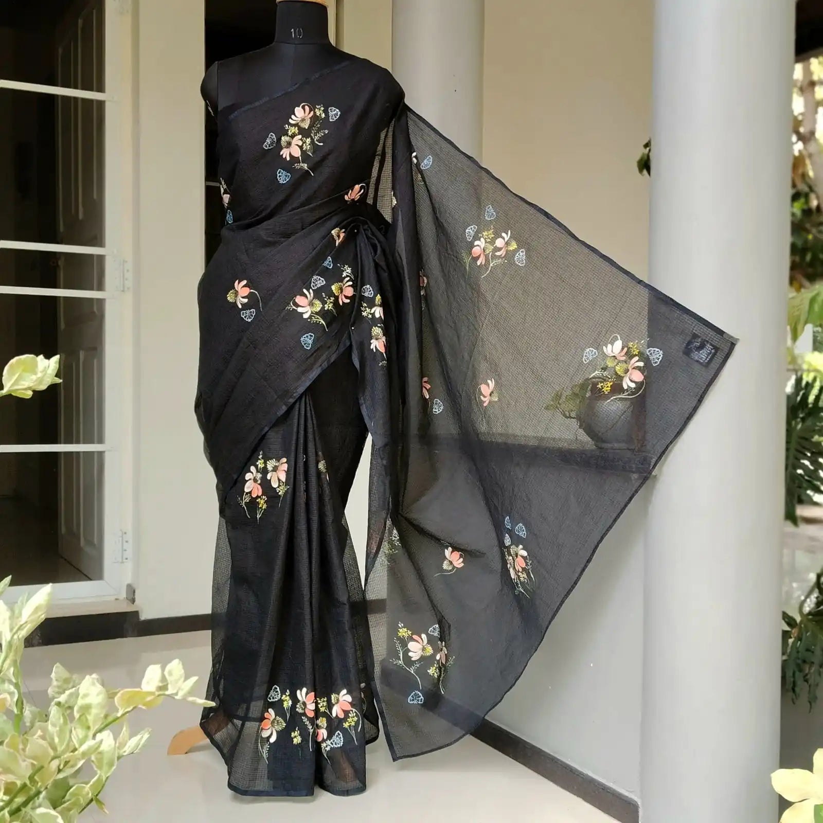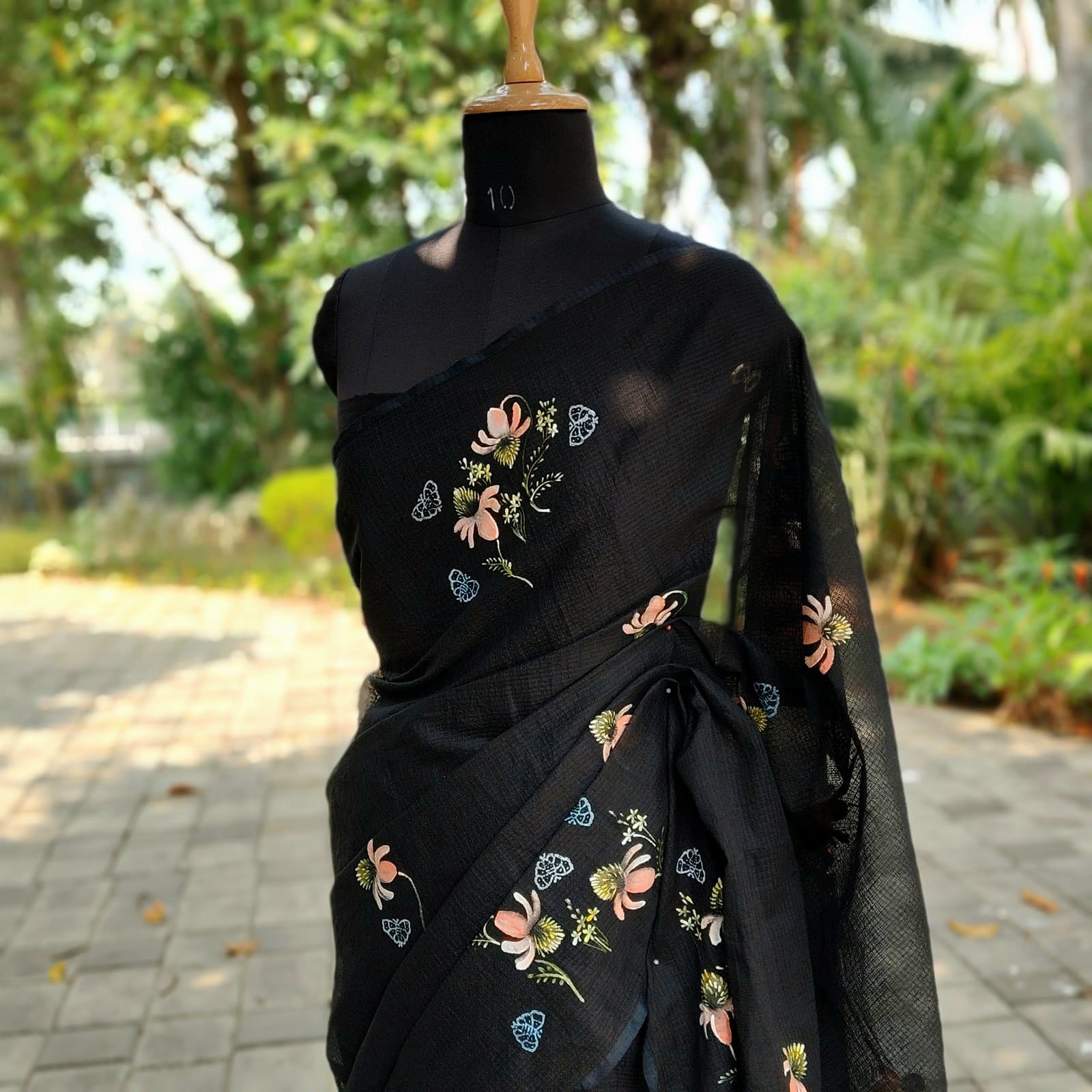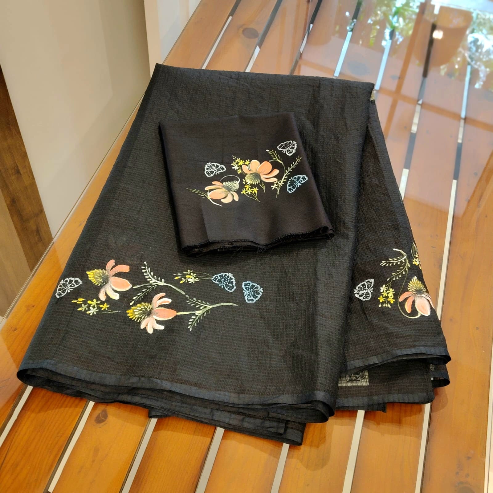 An elegant hand-painted pure Kota saree featuring beautiful floral motifs. This piece is a perfect addition to your hand-painted collection, adding a touch of grace and artistry to your wardrobe. Includes Raw Cotton blouse with painted sleeves