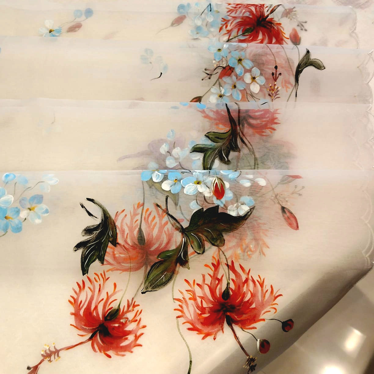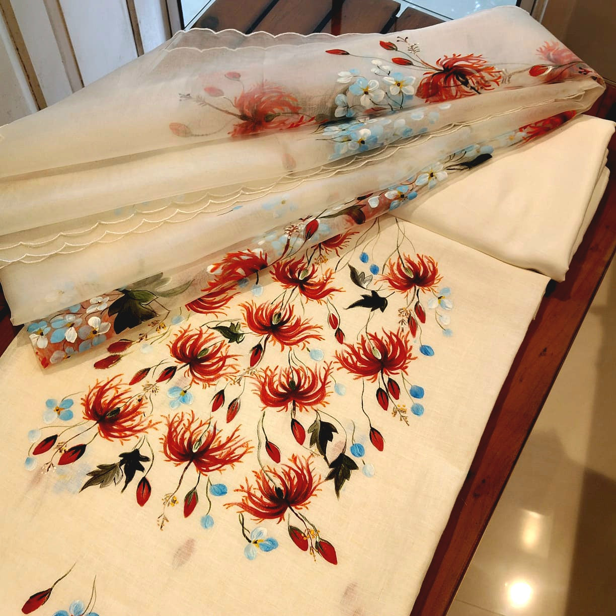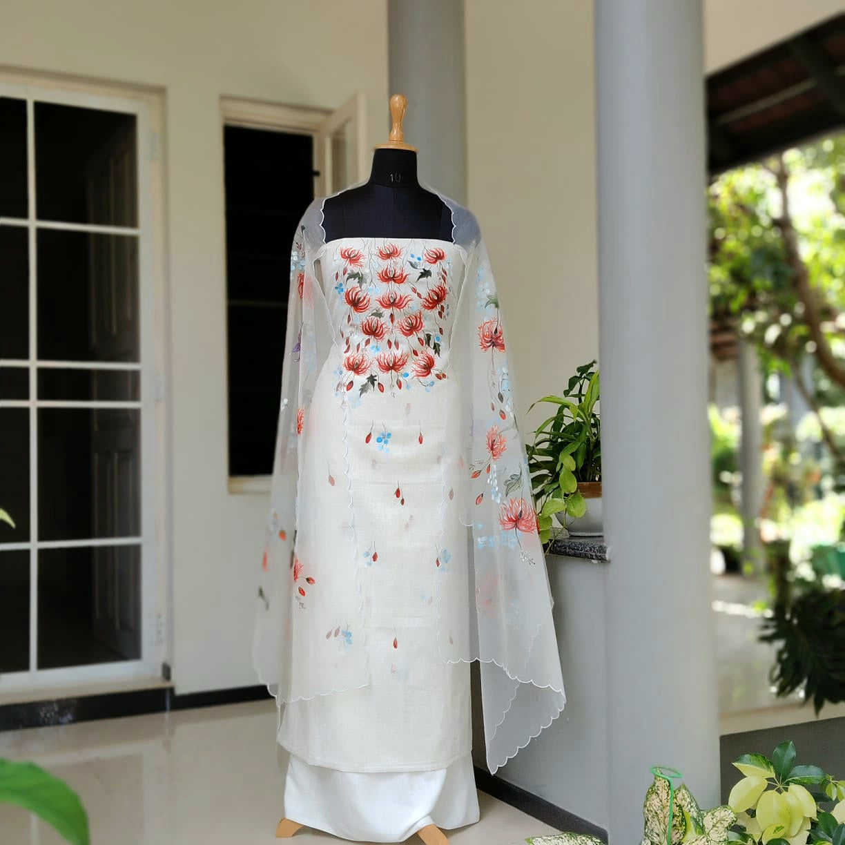 Exquisite hand-painted salwar kameez set in white with top and bottom crafted from pure cotton, while the silk organza dupatta features delicate hand-painted artwork and elegant scalloped edges. A truly unique creation — one of a kind, with no second piece available