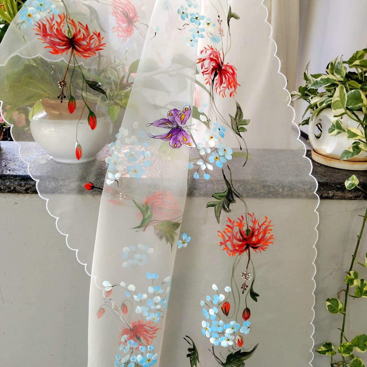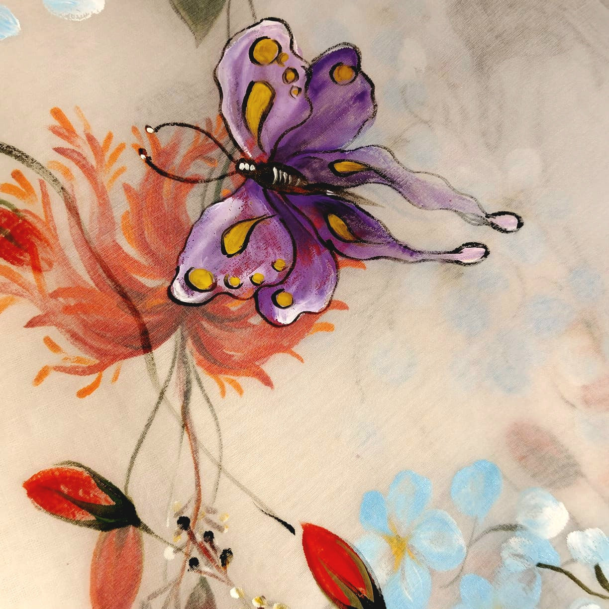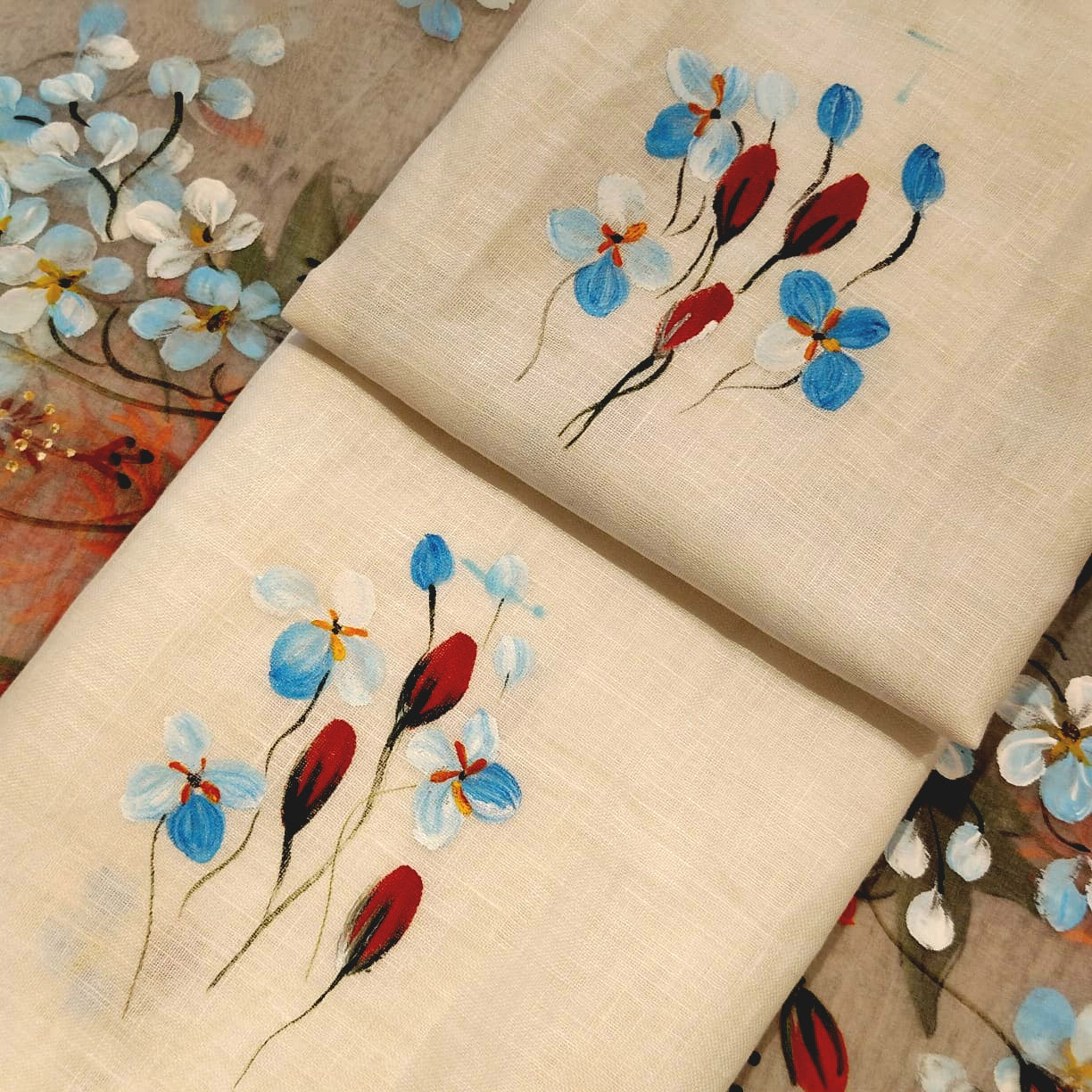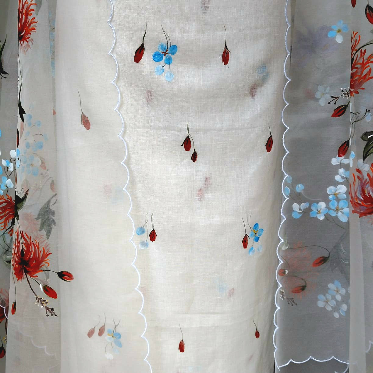 Exquisite hand-painted salwar kameez set in white with top and bottom crafted from pure cotton, while the silk organza dupatta features delicate hand-painted artwork and elegant scalloped edges. A truly unique creation — one of a kind, with no second piece available