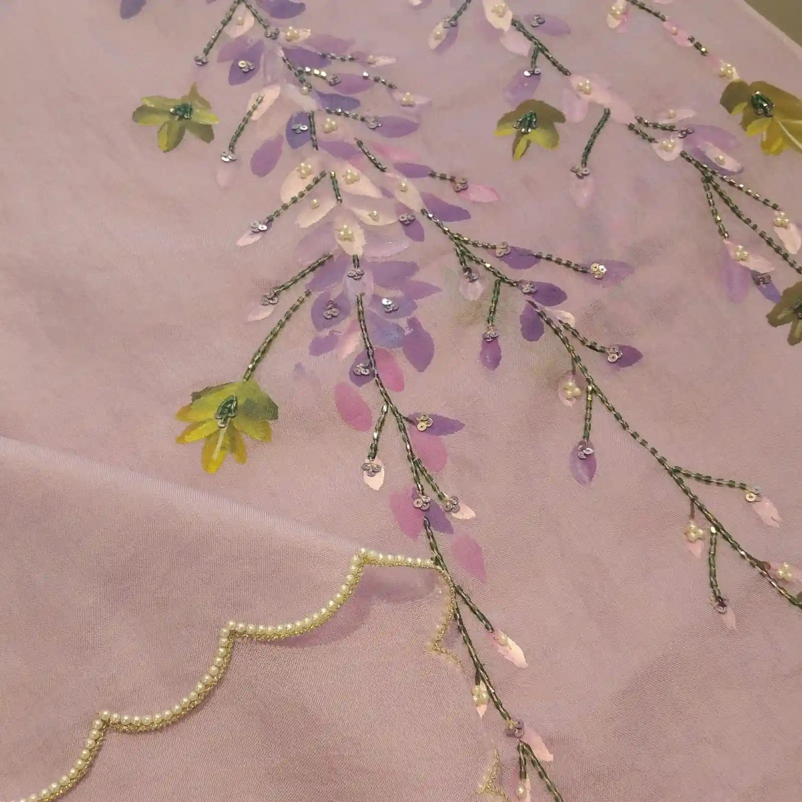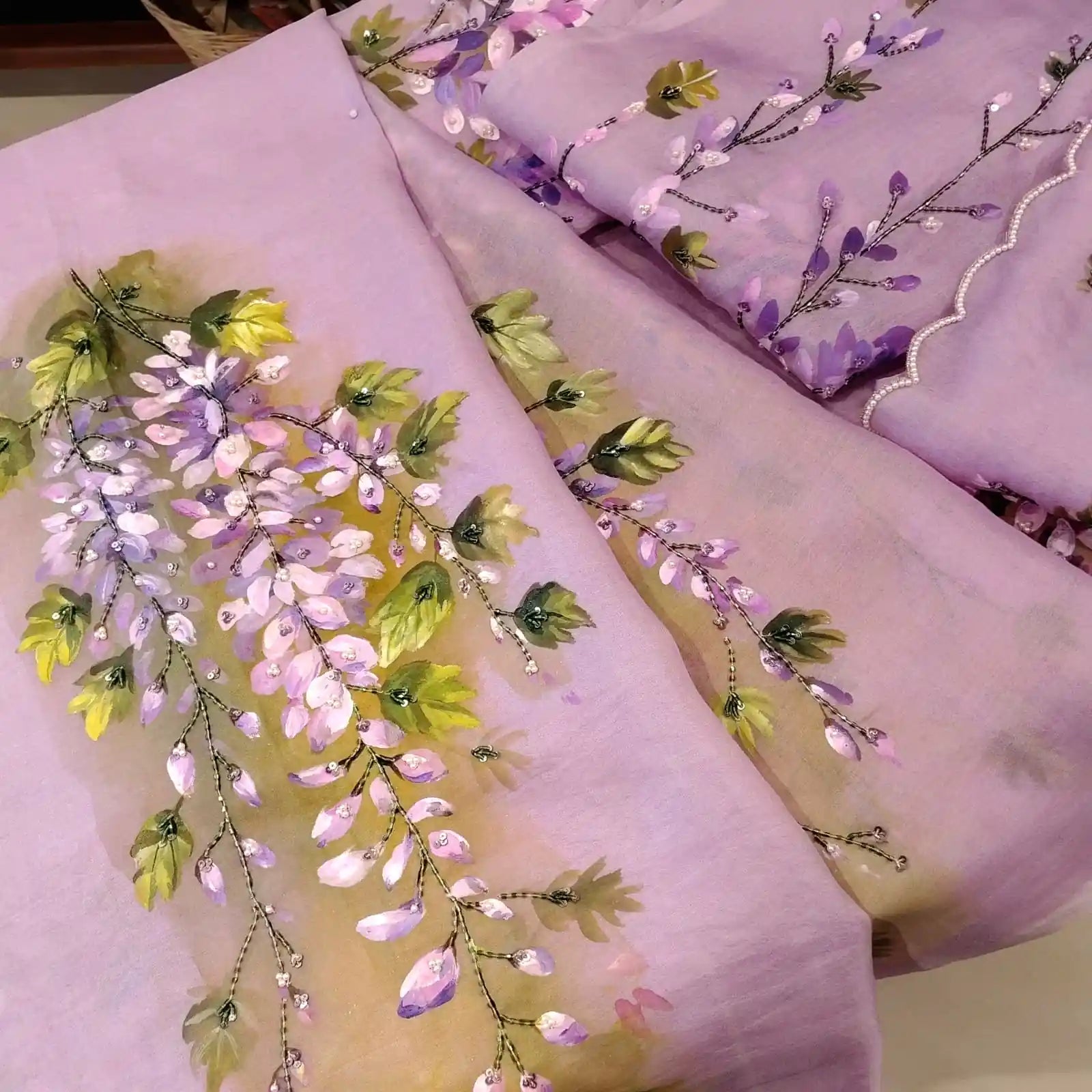 Gorgeous Hand- painted silk organza saree adorned with wild wisterias cascading in bunches across the fabric. Delicate beadwork adds a touch of shimmer, making it perfect for party wear. Comes with a 1-metre blouse piece featuring painted sleeves.