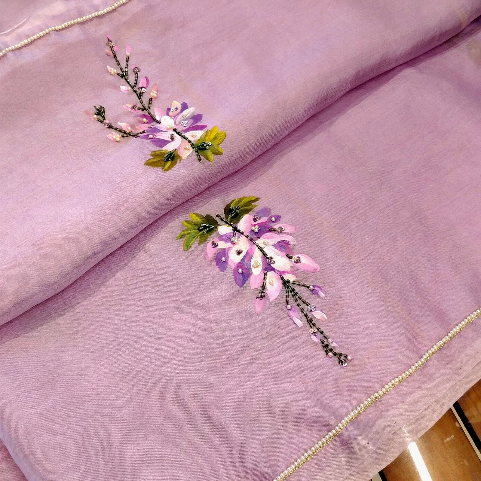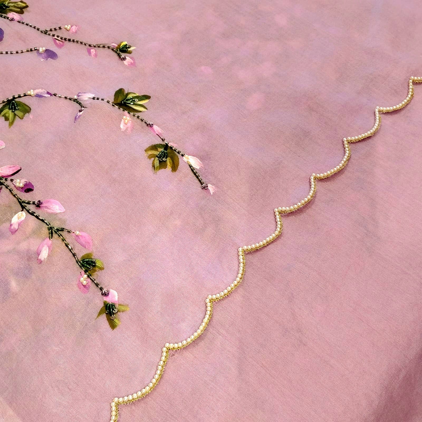 Gorgeous Hand- painted silk organza saree adorned with wild wisterias cascading in bunches across the fabric. Delicate beadwork adds a touch of shimmer, making it perfect for party wear. Comes with a 1-metre blouse piece featuring painted sleeves.