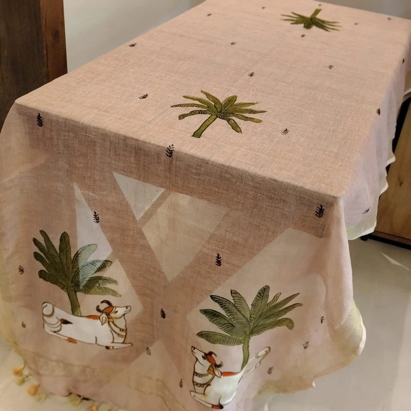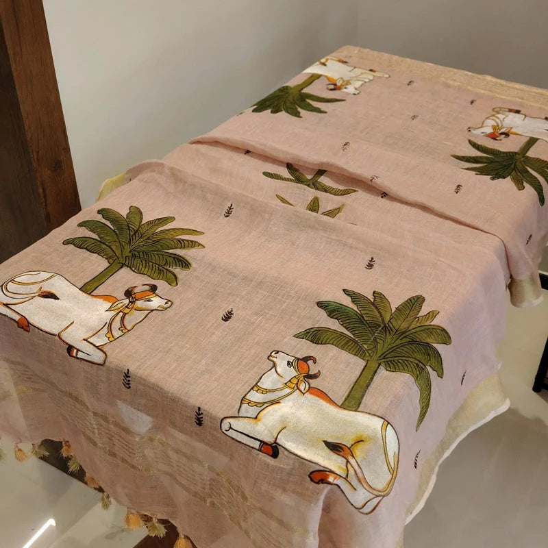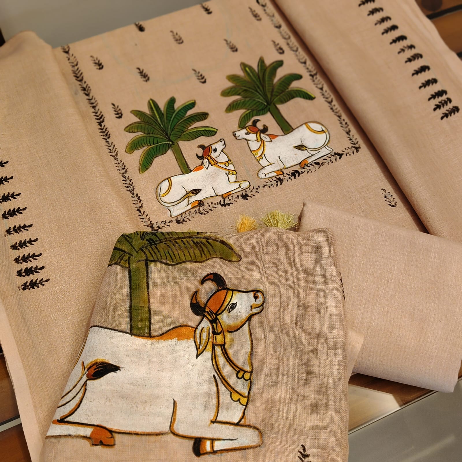 A stunning hand-painted light peach linen salwar kameez set, featuring Pichwai-style artwork on the top and dupatta.