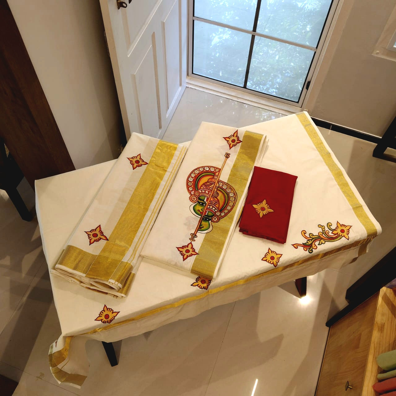 Traditional Kerala set mundu and men's double combo, adorned with exquisite hand-painted Kathakali and kerala mural style motifs – a perfect blend of heritage and elegance. Ideal for festive wear or a thoughtful gift!