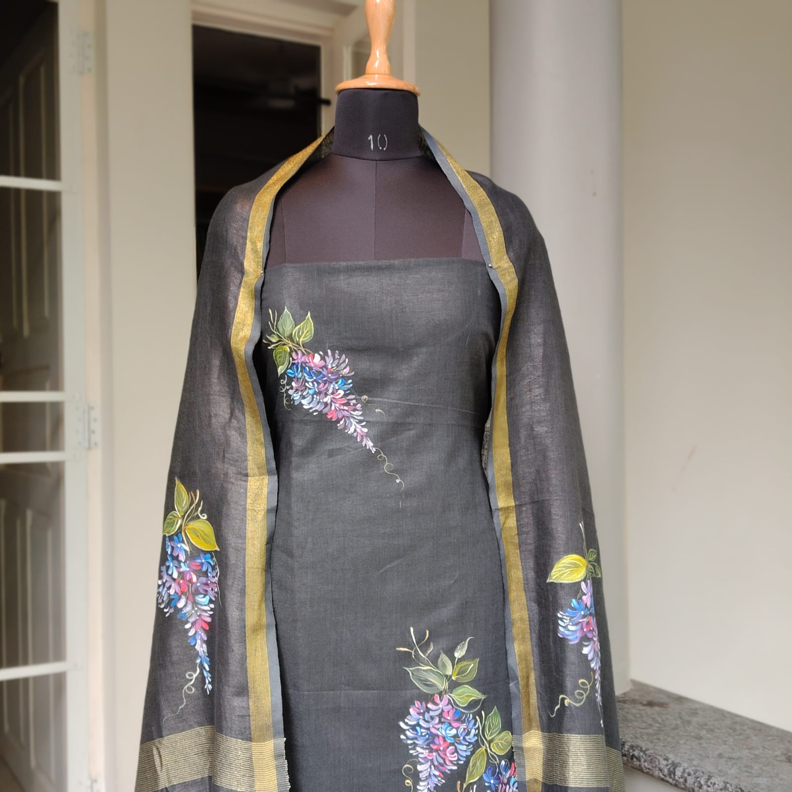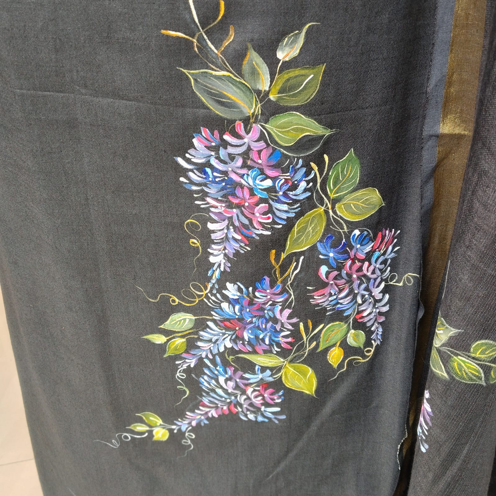 Beautiful hand-painted line salwar kameez set featuring delicate violet floral designs on the top and dupatta.