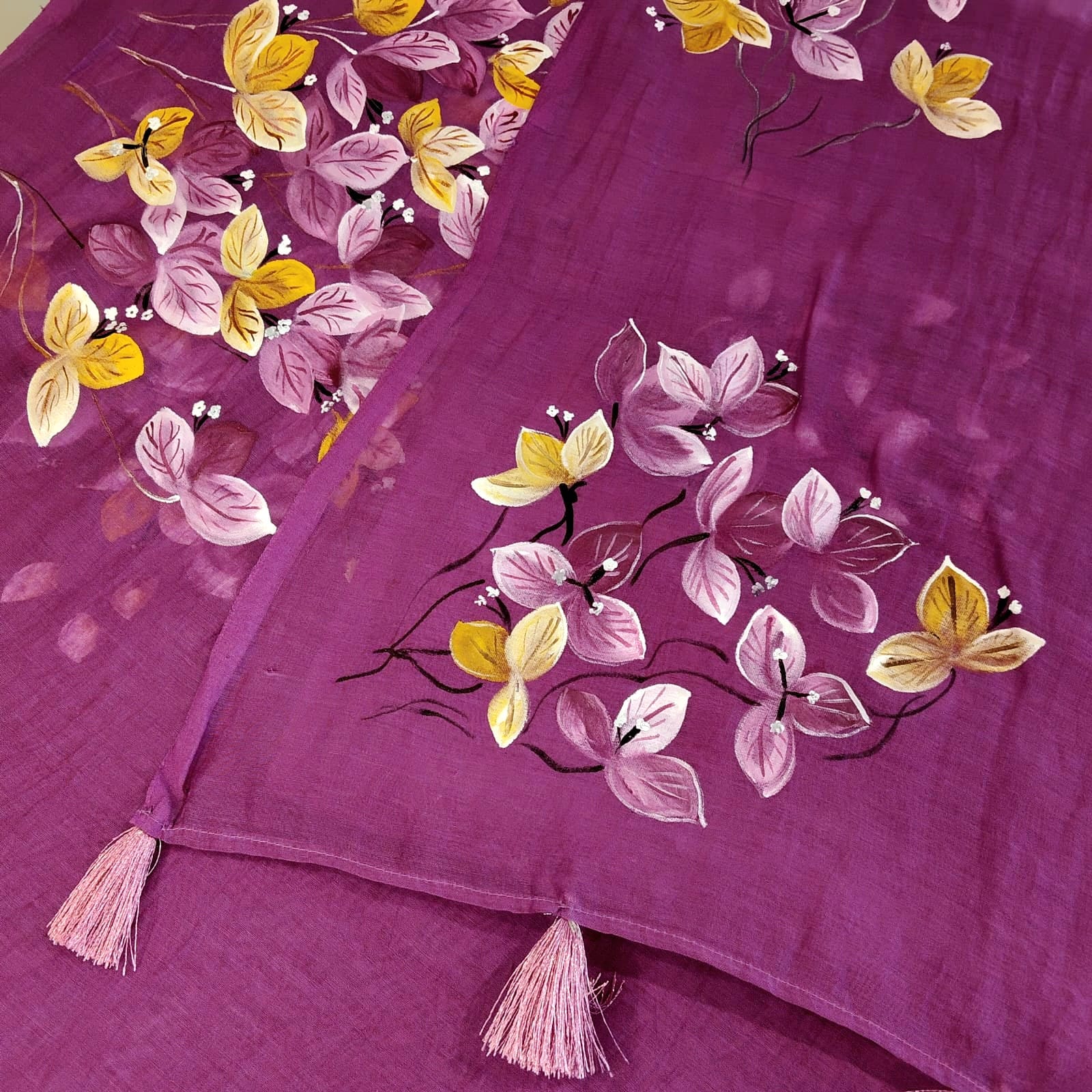 Pretty Mal Chanderi saree in a deep onion pink shade, beautifully hand-painted with bougainvillea flowers all over. Comes with a matching running blouse featuring hand-painted sleeves